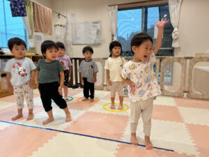 まだ暑い時期の室内活動では、運動会の練習を兼ねた遊びを取り入れていました。