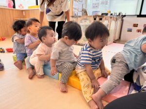 大きな子が走り回ることはありません。ハイハイや寝返り、つかまり立ちも、安全な遊具やクッションフロアの上で、のびのびと。